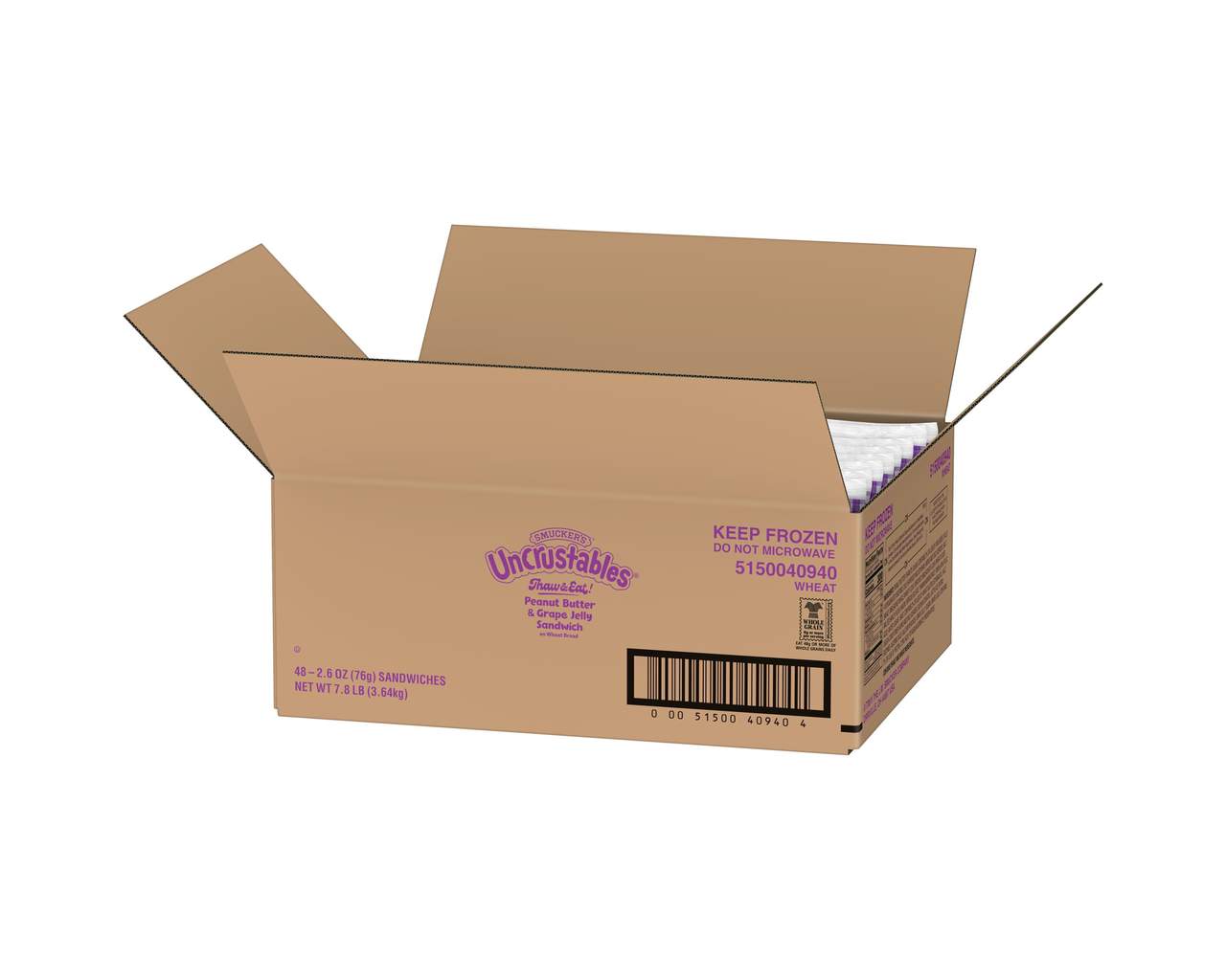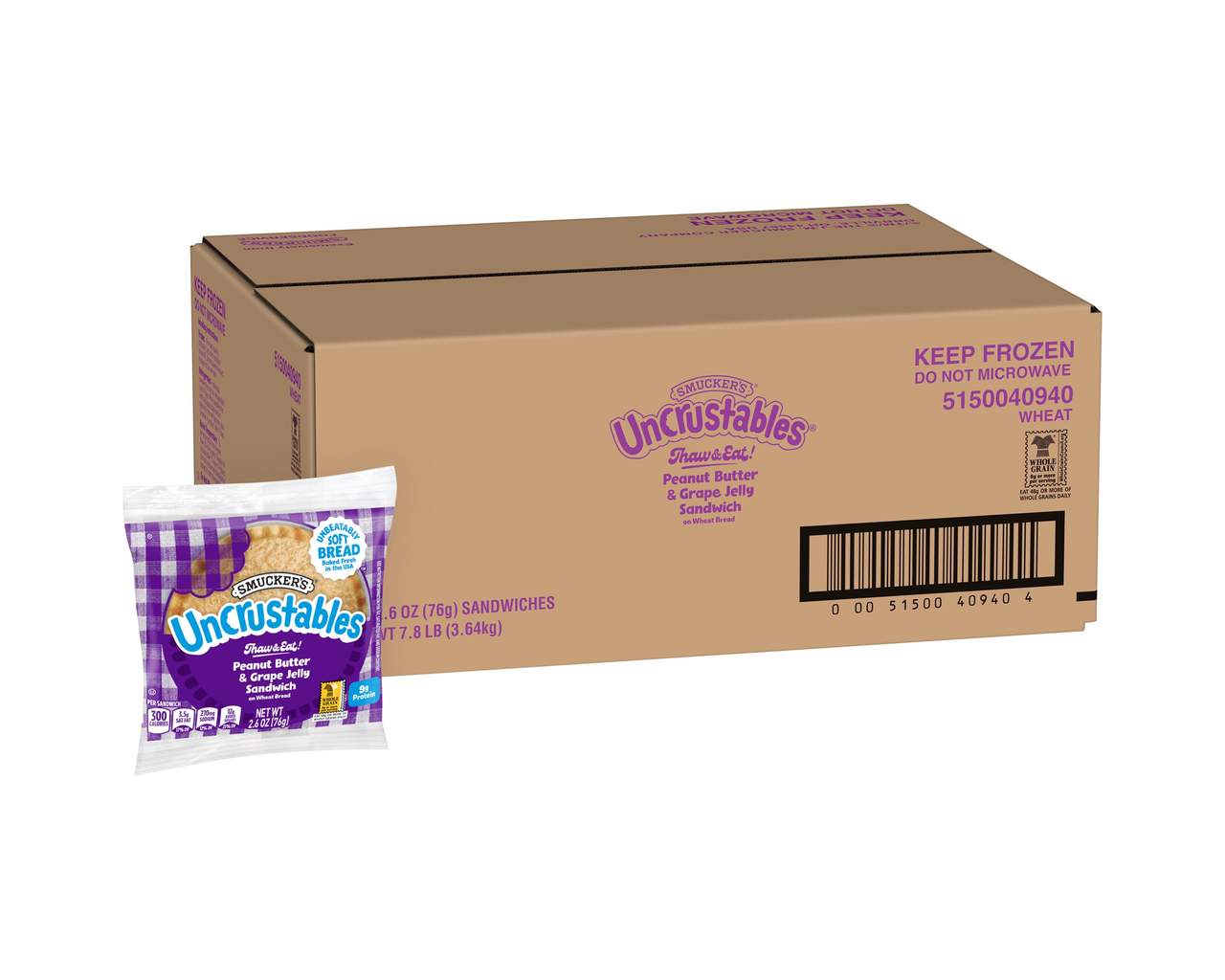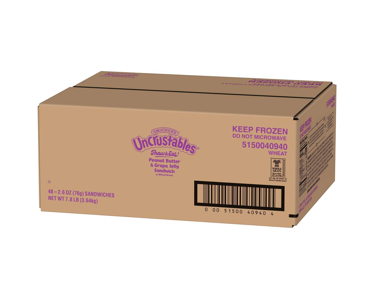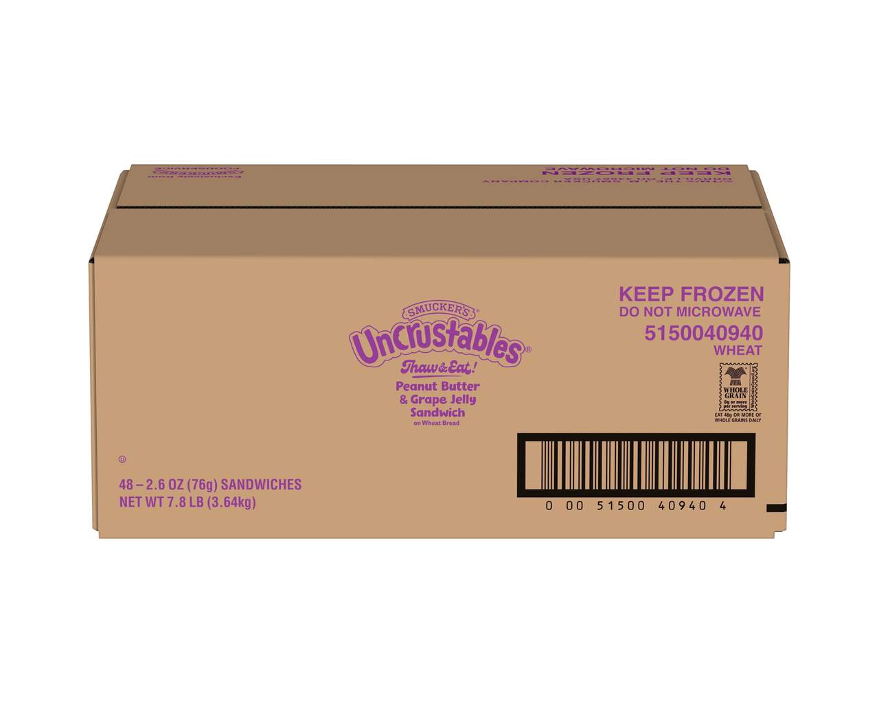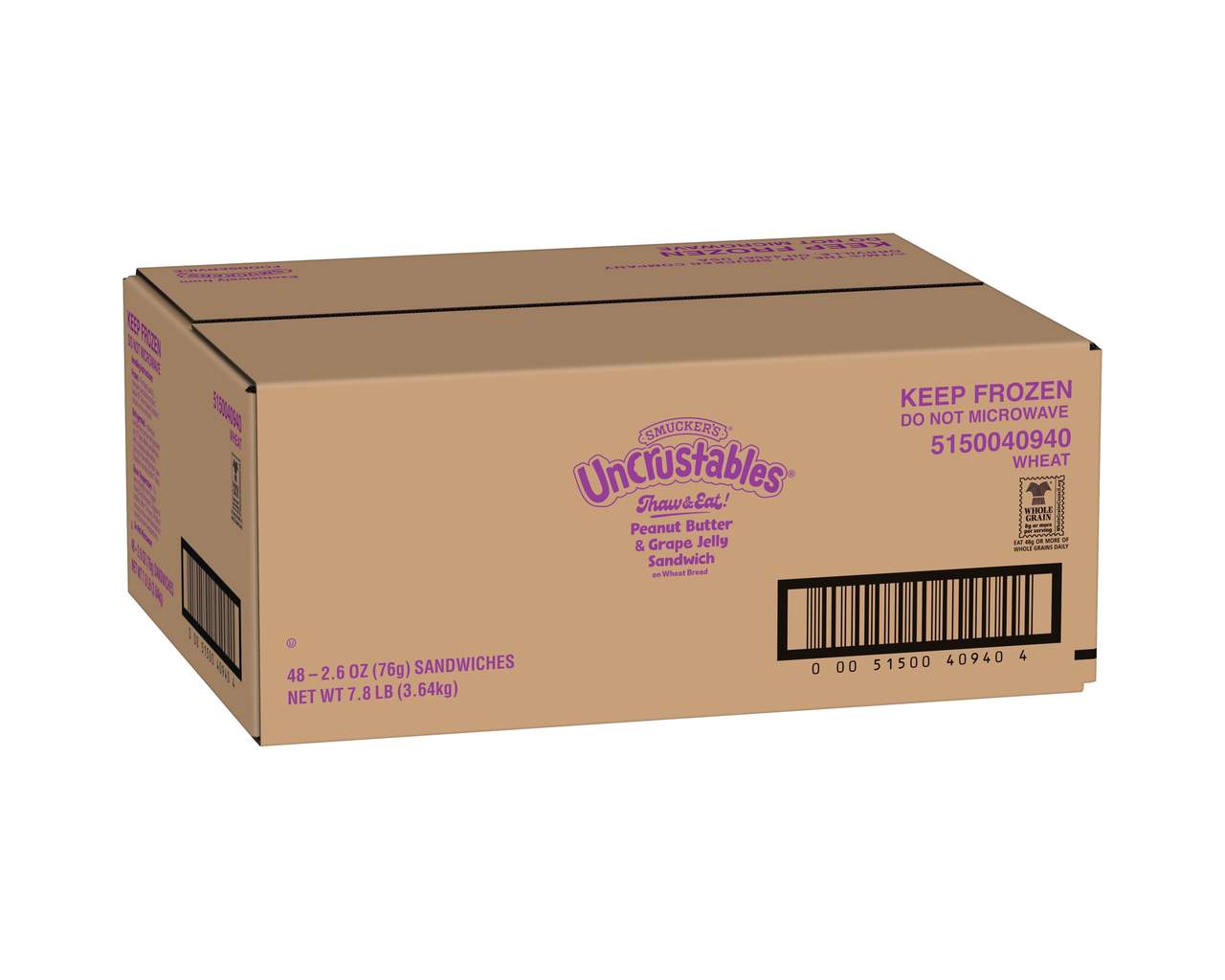 Consumers’ fast-paced lives demand a snack that can keep up. This irresistibly nostalgic, uber-convenient Smucker's Uncrustables sandwich combines creamy peanut butter and the classic flavor of Smucker's grape jelly. See how thaw-and-serve ease and iconic taste can help you deliver satisfaction all day long. Packaged individually in 48-count case for optimal freshness, less mess and less waste. Handling Instructions: Frozen - Product must be transported and stored at 0°F ± 10°F. \Once thawed product should not be refrozen. Frozen Shelf Life is up to 9 months. Refrigerated - Individual sandwiches can be refrigerated up to 7 days. Sandwiches must be labeled or marked by the operator with a disposal date before placing in refrigerator case. Dispose of product after 7 days. Room Temperature - To serve directly from freezer, thaw 30-60 minutes. Dispose of product after 10 hours. Do not microwave.