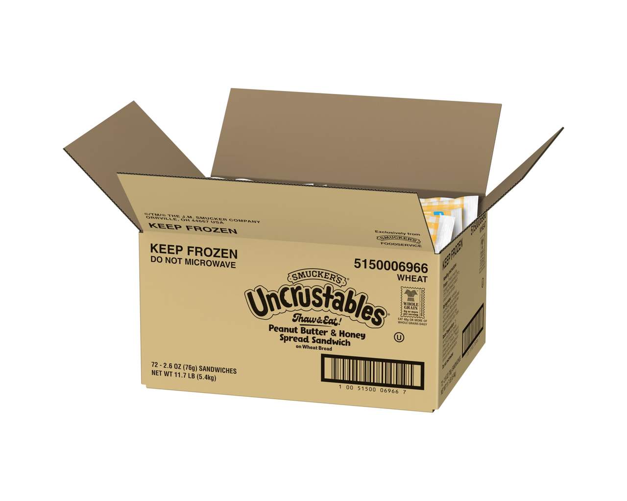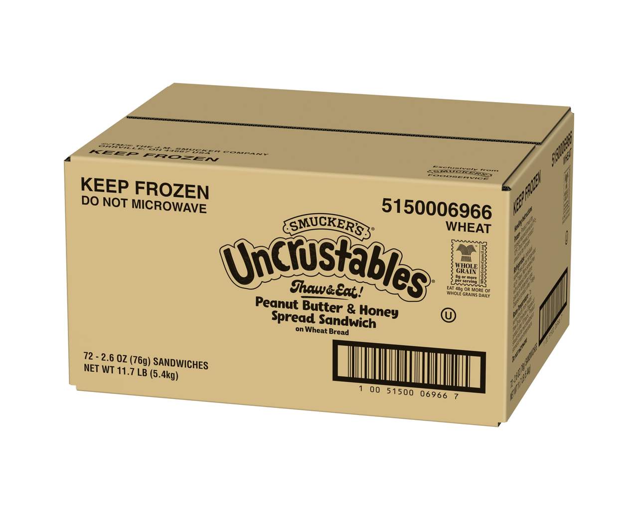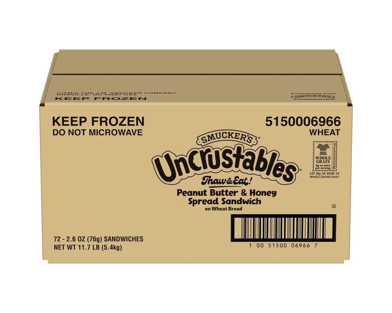 Sweet and smooth Smucker's honey spread meets rich and nutty peanut butter in this tasty twist on our crustless whole-wheat sandwich. See how perfectly sweet flavor and thaw-and-serve ease can help you deliver satisfaction all day long. Packaged individually in 72-count case for optimal freshness, less mess and less waste. Handling Instructions: Frozen - Product must be transported and stored at 0°F ± 10°F. \Once thawed product should not be refrozen. Frozen Shelf Life is up to 9 months. Refrigerated - Individual sandwiches can be refrigerated up to 7 days. Sandwiches must be labeled or marked by the operator with a disposal date before placing in refrigerator case. Dispose of product after 7 days. Room Temperature - To serve directly from freezer, thaw 30-60 minutes. Dispose of product after 10 hours. Do not microwave. Child Nutrition Number 100909 (Longmont) 100910 (Scottsville) Commodity Eligible