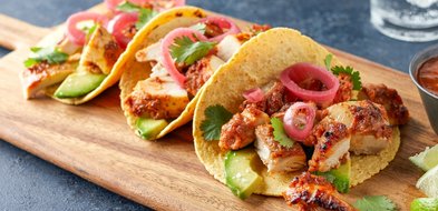 This full-flavored Thai flatbread is topped with Asian-slaw-coated chicken and garnished crunchy fried rice noodles, chives and black sesame seeds.